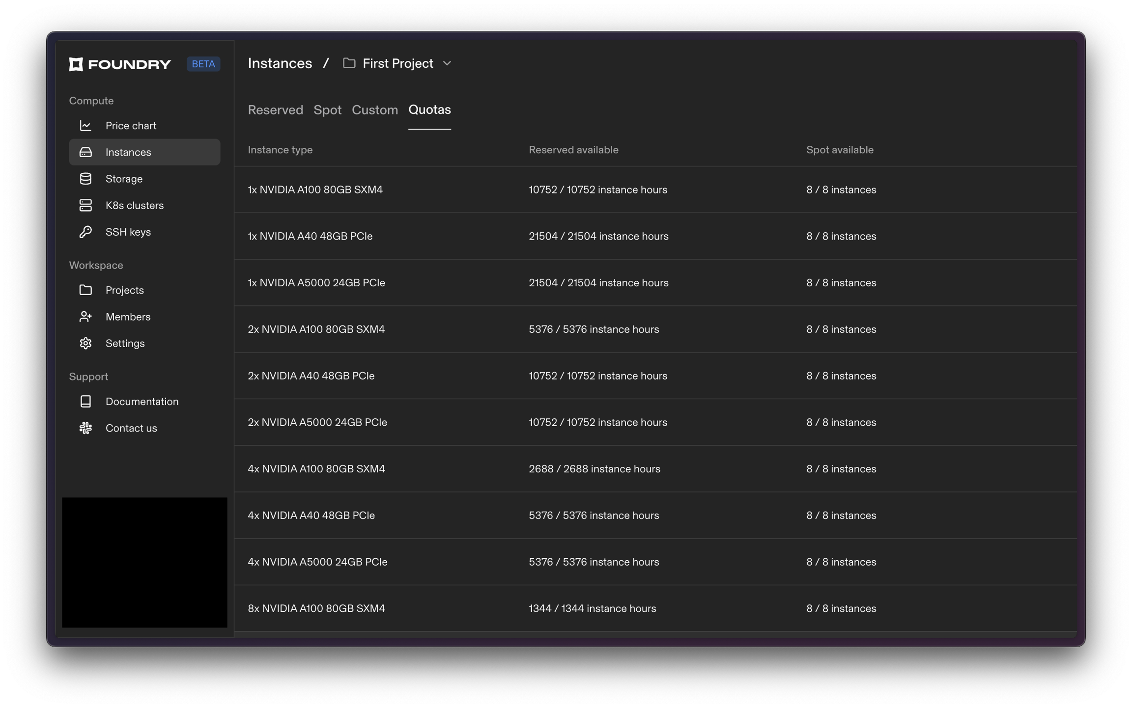Reservation quotas are the maximum number of forward-looking reserved instance hours. For example, if your reservation quota for an 8x A100 instance is 72 instance hours, you can reserve 1 instance for 72 hours or 4 instances for 18 hours (you pick the shape of your compute).